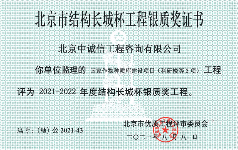 本工程于2021年8月8日被北京市優質工程評審委員會評定為“北京市建筑(結構)長城杯”工程!投入使用一年多來,運行穩定,效果良好,得到使用單位的高度評價。