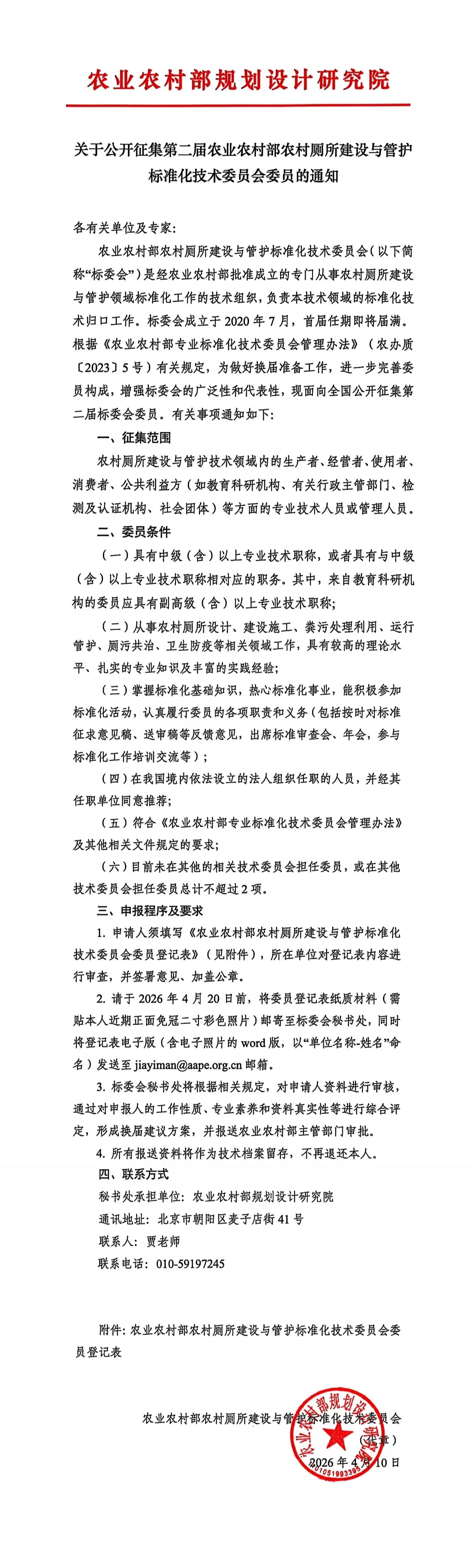 關(guān)于公開征集第二屆農(nóng)業(yè)農(nóng)村部農(nóng)村廁所建設(shè)與管護(hù)標(biāo)準(zhǔn)化技術(shù)委員會(huì)委員的通知